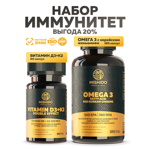 Подарочный набор MISHIDO Омега 3 с красным корейским женьшенем 180 капсул + Витамин D3 Д3 + K2 60 капсул