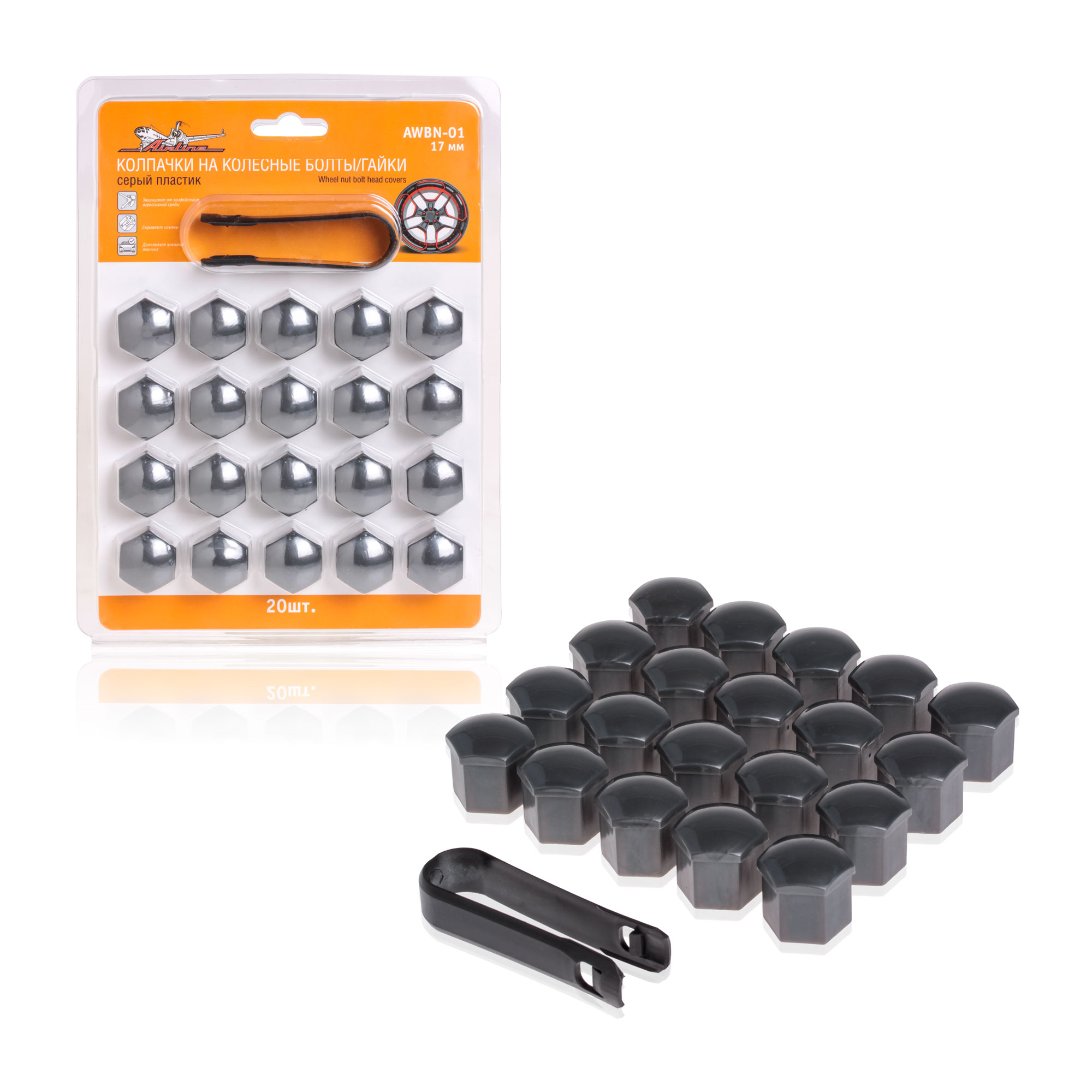 Колпачки на колесные болты/гайки 17 мм, 20 шт.+ съёмник, пластик, серые AWBN-01