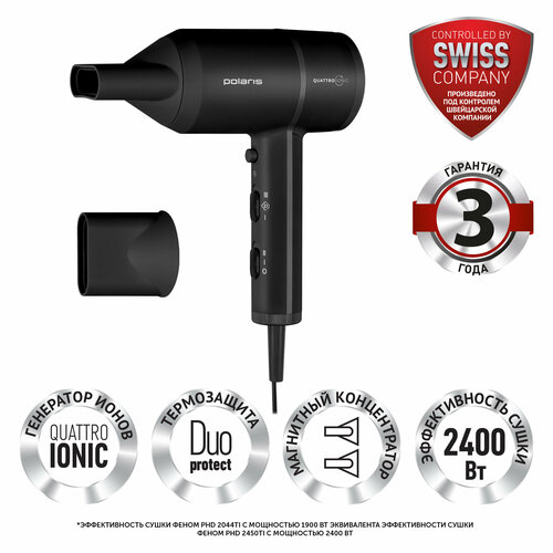 Вт. Эргономичная ручка с «мягким» нескользящим покрытием корпуса предназначена специально для того, чтобы сделать процесс сушки волос более удобным. Каждая девушка мечтает о гладких и блестящих волосах. Но летом под воздействием ультрафиолетовых лучей, а зимой из-за статического электричества они становятся ломкими и непослушными. Благодаря турмалиновой ионизации волосы будут защищены от повреждения и пересушивания, поскольку ионы притягивают влагу из окружающего воздуха, придавая им сияние и здоровый блеск. В фене Polaris PHD 2245Ti предусмотрена функция обдува холодным воздухом, которая позволяет зафиксировать прическу. Благодаря наличию 3-ех температурных и 2-ух скоростных режимов вы можете подобрать оптимальную скорость и температуру подачи воздуха в зависимости от типа волос. Функциональный и стильный фен для волос Polaris PHD 2245Ti станет настоящим профессиональным