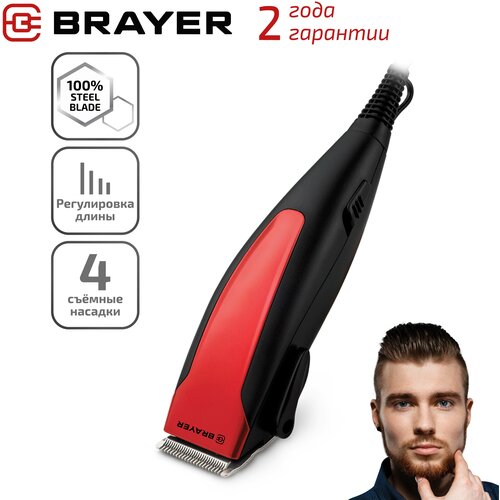 Машинка для стрижки сетевая 15 Вт BRAYER BR3431, 4 насадки, черный/красный