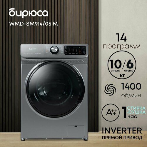 Стиральная машина с сушкой, прямой привод, загрузка 10 кг стирка/6 кг сушка, Бирюса WMD-SM914/05, 1400 оборотов, сенсорный дисплей, цвет металлик