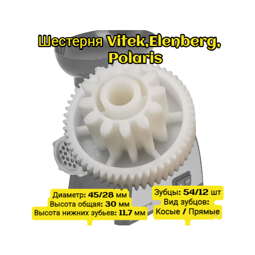 Шестерня для мясорубки Vitek, Elenberg, Polaris Диаметр: 45/28 мм Высота общая: 30 мм, нижних зубьев: 11,7 мм Зубцы: 54/12 шт Зубья: Косые / Прямые