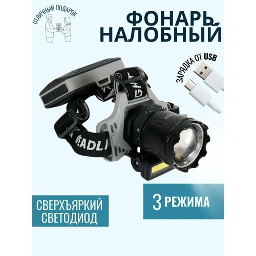 Налобный фонарь светодиодный,4 режима свечения, влагозащитой,/Аккумуляторный, LED, для рыбалки, охоты/с зарядкой от USB, водонепроницаемый