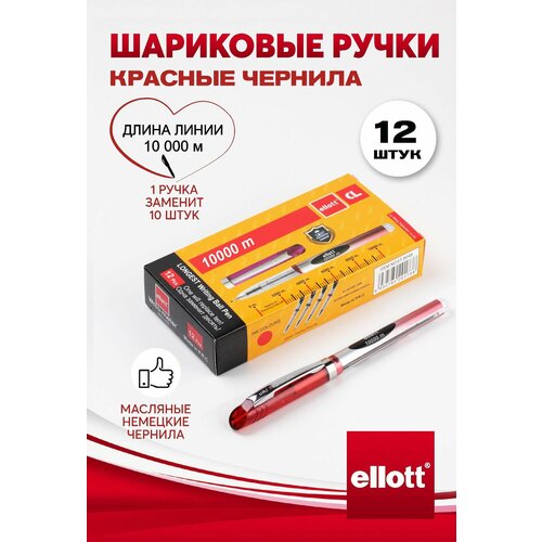 Ручки шариковые красные Ellott 10000 м, набор 12 штук, толщина линии 0,5 мм