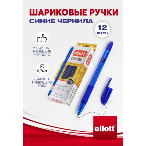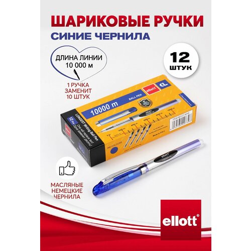 Ручки шариковые синие Ellott 10000 м, набор 12 штук, толщина линии 0,5 мм