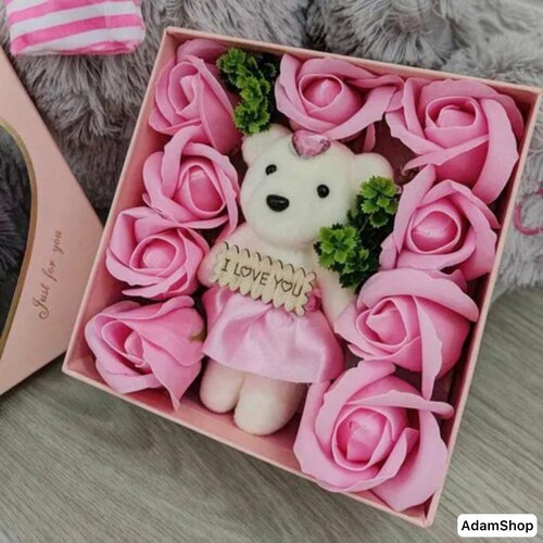 Подарочный набор 9 роз из мыла с плюшевым медведем