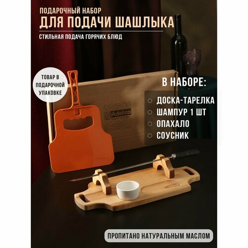 Adelica Подарочный набор для подачи шашлыка: доска - тарелка 40×18×5,5 см, шампур 1 шт, опахало, соусник, берёза