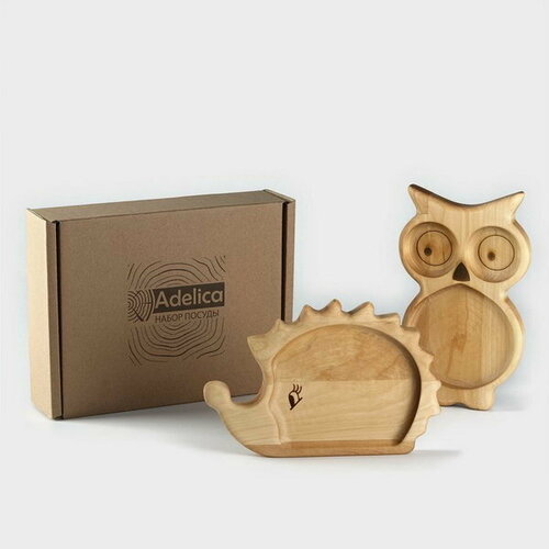 Набор деревянной посуды "Советское детство", менажница, ежик 21x14x1.8 см, сова 21.5x13x1.8 см, в подарочной коробке