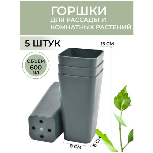 Горшок для рассады, 600 мл, 8 см × 8 см × 15 см, набор 5 шт, стаканы для цветов, горшочки маленькие цветочные, стаканчики пластиковые квадратные
