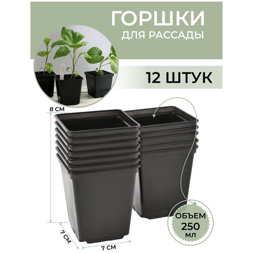 Горшок для рассады, 250 мл, 7 см × 7 см × 8 см, набор 12 шт, стаканы для цветов, горшочки маленькие цветочные, стаканчики пластиковые квадратные
