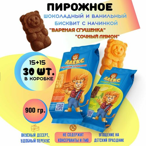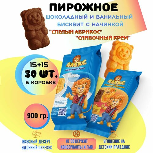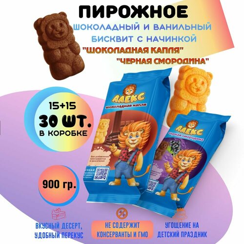 Пирожное бисквитное львенок алекс, шоколадный и ванильный бисквит с начинкой, набор 30 шт. по 30 г