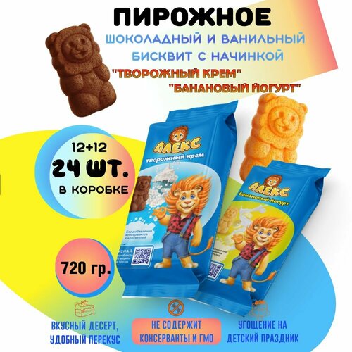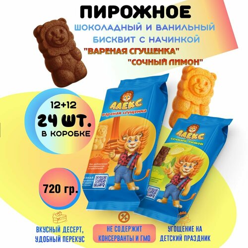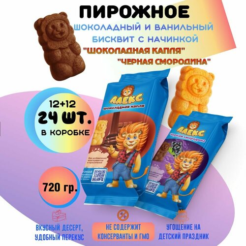 Пирожное бисквитное львенок алекс, шоколадный и ванильный бисквит с начинкой, набор 24 шт. по 30 г