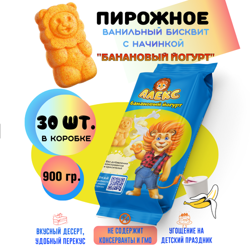 Пирожное бисквитное в упаковке львенок Алекс, классический бисквит с начинкой "Банановый йогурт" , бокс пирожных 30 шт. по 30 г