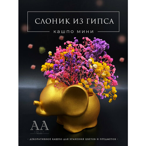 Кашпо декоративное из гипса маленькое Слоник золотой / Органайзер для зубочисток и ватных палочек