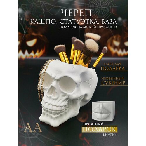 Кашпо Череп из гипса/ Органайзер для кисточек и канцелярии / Декор на хэллоуин аксессуар украшение