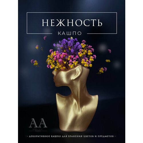 Декоративное кашпо из гипса для цветов голова девушка бюст Нежность золотая