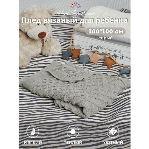 Плед вязаный детский хлопковый для новорожденного , плед для ребенка хлопковый в коляску , на выписку , на кровать для малыша AlmaForHome 100х100 см / темно-серый