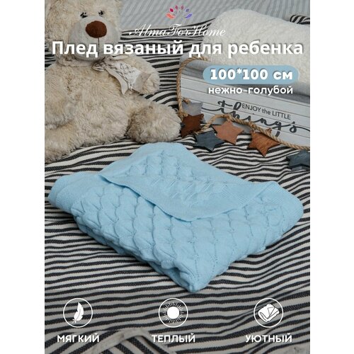 Плед вязаный детский хлопковый для новорожденного , плед для ребенка хлопковый в коляску , на выписку , на кровать для малыша AlmaForHome 100х100 см / нежно-голубой