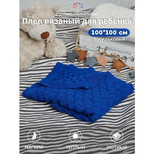 Плед вязаный детский хлопковый для новорожденного , плед для ребенка хлопковый в коляску , на выписку , на кровать для малыша AlmaForHome 100х100 см / василек