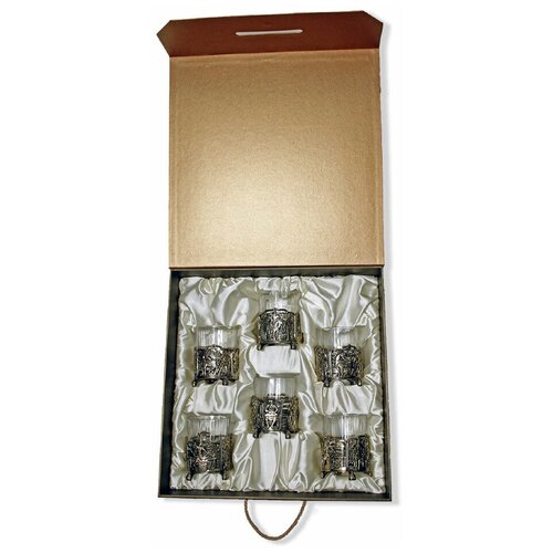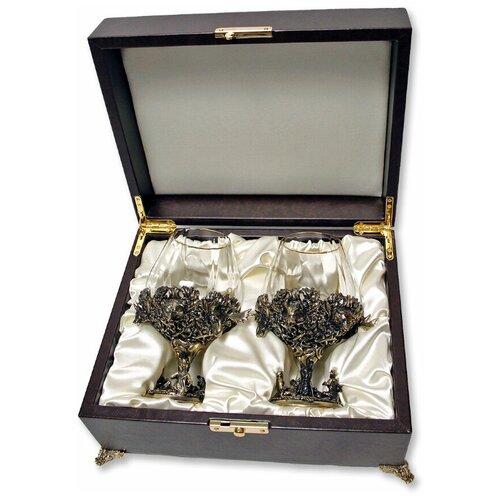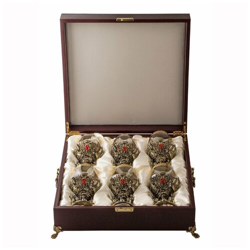 Набор для чая "Скорпион" золочение(3 предмета) дерев. футляр, хрустальный стакан, гравировка, ложка