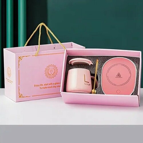 Керамическая кружка с подогревом от usb с крышкой и ложкой, 350 мл, розовая