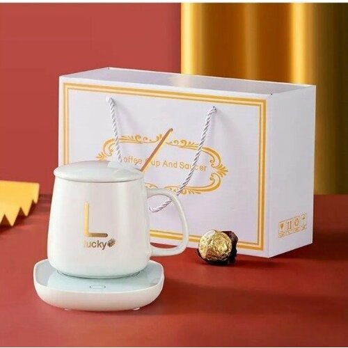 Керамическая кружка с подогревом с крышкой и ложкой, 350 мл, белая
