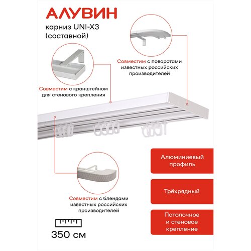 Карниз UNI-X3 для штор алюминиевый потолочный трехрядный Алувин составной 350 см (2х175 см)
