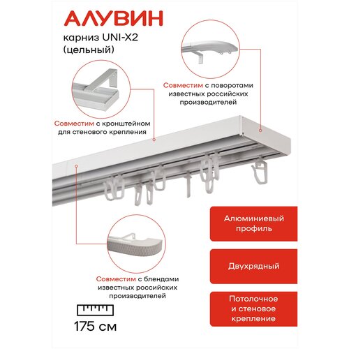 Карниз UNI-X2 для штор алюминиевый потолочный двухрядный Алувин 175 см