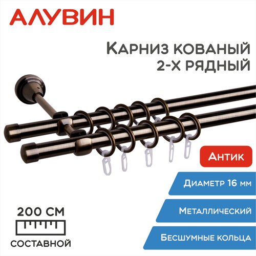 Карниз для штор кованый металлический двухрядный D16 Алувин составной 200 см (4х100 см), цвет Антик