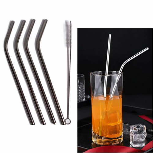 Трубочки для коктейлей 4 шт, 5/215 мм, с щеточкой, нержавеющая сталь, нейлон -- 5 предметов.