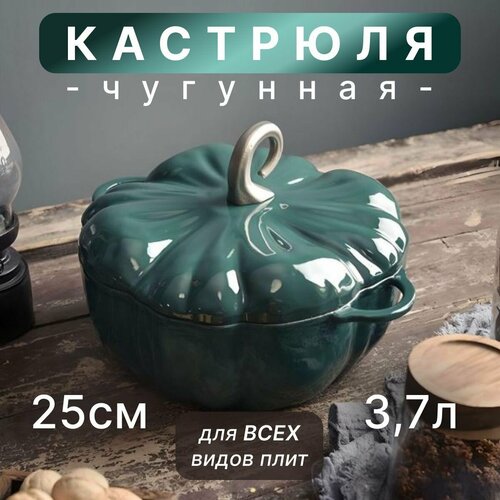 Чугунная кастрюля с крышкой ALWOtech "Тыква" 25 см, 3,7 литра, зеленая, кокотница