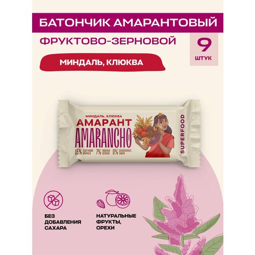 Батончики фруктово-зерновые Amarancho, Шоу-бокс 9 шт, амарант, миндаль, клюква, ПП батончики без сахара
