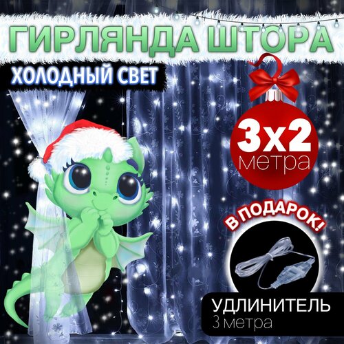 Гирлянда Штора Занавес интерьерная 3х2 м, холодный свет, электрогирлянда светодиодная, удлинитель 3 м в подарок / новогодняя гирлянда