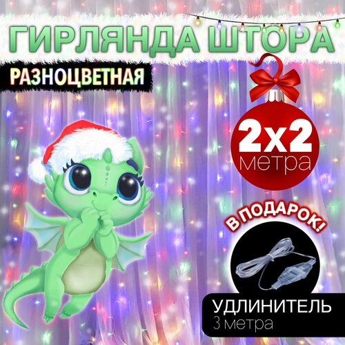 Гирлянда Штора Занавес интерьерная 2х2 м, разноцветная, электрогирлянда светодиодная, удлинитель 3 м в подарок / новогодняя гирлянда