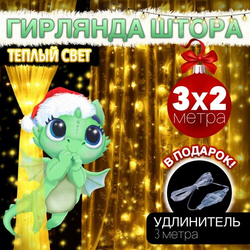 Гирлянда Штора Занавес интерьерная 3х2 м, теплый свет, электрогирлянда светодиодная золотая, удлинитель 3 м в подарок / новогодняя гирлянда