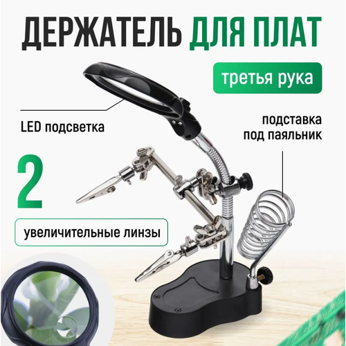 Держатель для плат третья рука с лупой, подсветкой и подставкой для паяльника