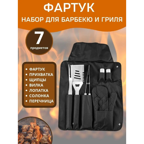 Набор для барбекю 7 предметов с фартуком BBQ / Инструменты для гриля, мангала 7 шт. /фартук/перечница/солонка/Подарочный набор для шашлыка