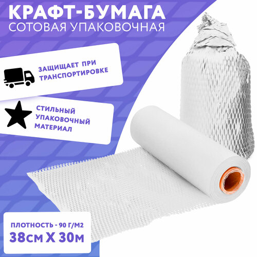 Упаковочная крафт бумага сотовая APQ Supply, 30м, белая. Подарочная бумага в рулоне новогодняя, для подарков, для цветов, оберточная бумага тишью