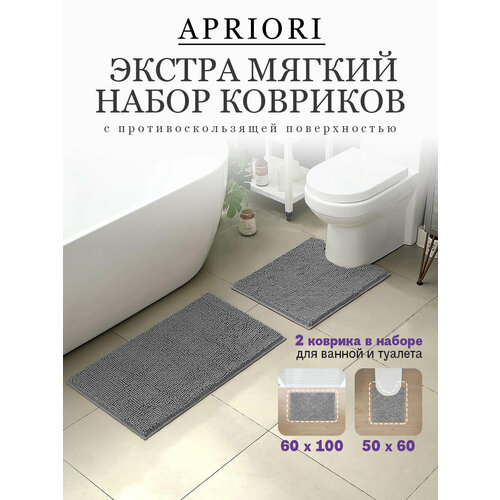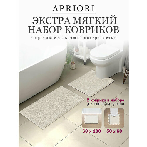 Набор ковриков для ванны и туалета 2 шт Apriori 60х100см и 50х60см , мягкий противоскользящий ворсовый влаговпитывающий