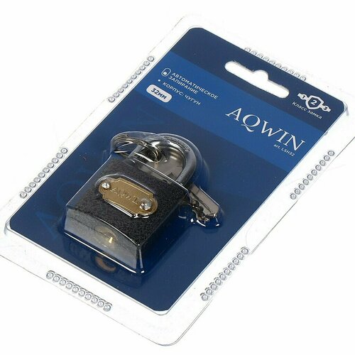 Замок навесной Aqwin, LL32, блистер, навесной, цилиндровый, 32 мм, с удлиненной дужкой, 3 ключа