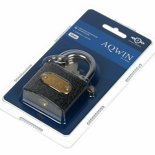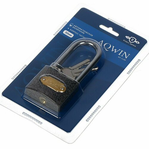 Замок навесной Aqwin, LL50, блистер, навесной, цилиндровый, 50 мм, с удлиненной дужкой, 3 ключа