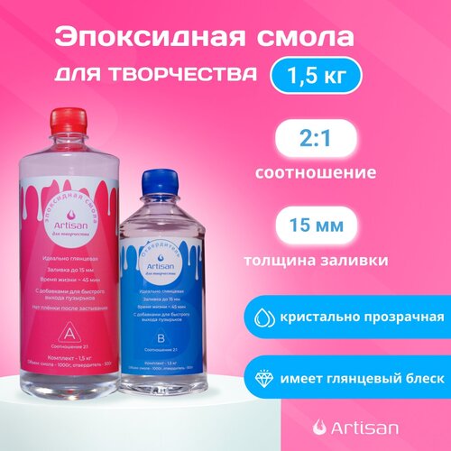 Эпоксидная смола для творчества (средневязкая, прозрачная) Artisan 1.5кг для украшений, столешниц, заливки в силиконовые молды, набор с отвердителем