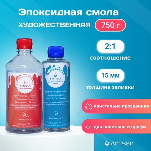 Эпоксидная смола для творчества (густая, прозрачная) Artisan Художественная 750г для рисования, столешниц, в силиконовые молды, набор с отвердителем