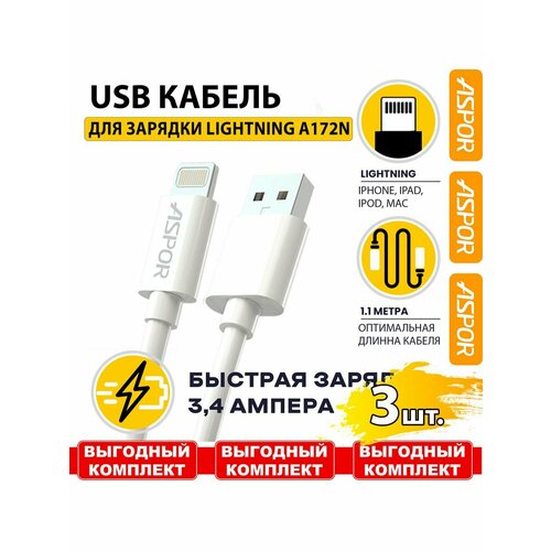 Кабель USB Lightning, 3.4A, для iPhone, iPad, AirPods 3шт.