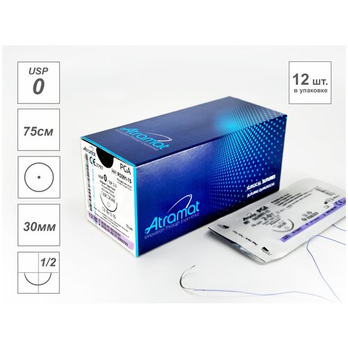 Полигликолид (ПГА, PGA), шовный материал атрамат, USP 0 фиолетовый 75см, игла колющ. 30мм 1/2, R3091-75 ATRAMAT, пр-во Мексика, 12 шт./уп.