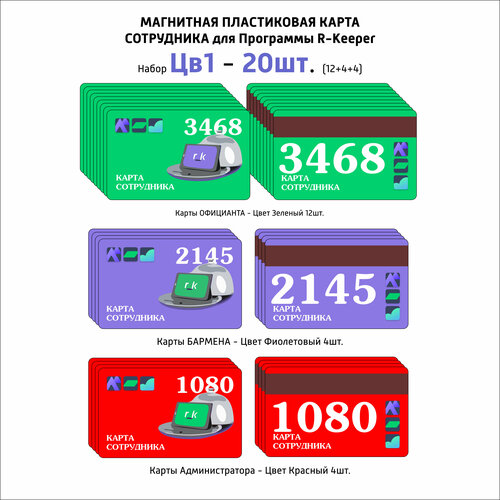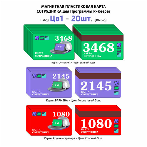 Пластиковая карта магнитная для сотрудников для системы R-Keeper 20 шт. БЗЧ (Зеленые 10шт, Фиолетовые 5шт, Красные 5шт)