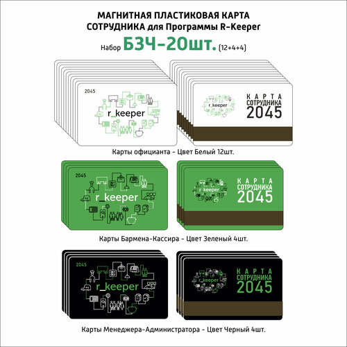Пластиковая карта магнитная для сотрудников для системы R-Keeper 20 шт. БЗЧ (Белые 12шт, Зеленые 4шт, Черные 4шт)
