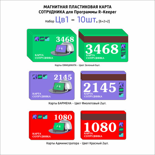 Пластиковая карта магнитная для сотрудников для системы R-Keeper 10 шт. БЗЧ (Зеленые 6шт, Фиолетовые 2шт, Красные 2шт)