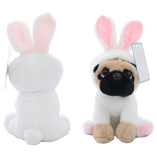 Мягкая игрушка собака Мопс в костюме зайца, белая, 20х15х12 см