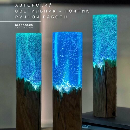 Светильник ночник дизайнерский из смолы и дерева ручной работы для декора дома голубого бирюзового цвета настольный на батарейках